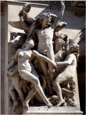浮雕《馬賽曲》,是一座歌頌法國大革命的史詩性作品,是無以倫比的紀念碑,它那巍峨磅礴的氣勢長久地震撼人心。呂德用自己超凡的想象和藝術(shù)構(gòu)思,將一座石墻變成了一個英雄史詩般的幻想,編織成巨大的火焰般的意境。《馬賽曲》被安放在法國愛德華廣場的大凱旋門上,是法國人民熱愛和平、自由的不朽象征。