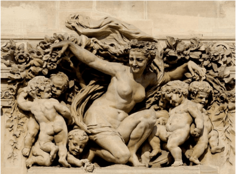 《花神》這件作品是應(yīng)法國巴黎盧浮宮花鳥陳列館的訂貨而完成的一件裝飾雕刻。主題是頌揚花神給人間帶來幸福與歡樂。浮雕被鑲嵌在建筑物的墻面上,呈橫長形。構(gòu)圖中心那個煥發(fā)著少女青春美的花神,是以裸體來展現(xiàn)的:她蹲踞在地面上,棲身于萬花叢中,她將花朵灑向周圍的孩子們,女神的表情愉快而生動,并含有古典味道。身邊的一群天真爛漫的小天使,活潑可愛,有的與花神嬉戲,有的在花叢中鉆進鉆出,有的在作輕盈的環(huán)舞。這些小天使的生動姿態(tài)來自雕塑家對生活的認真觀察,形象鮮明而生動。