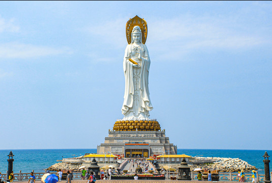 著名的海南三亞南海觀音像高達(dá)108米,造像工程歷時(shí)六載,是世界上最高的觀音像。圣像巍峨壯觀,莊嚴(yán)慈悲,像體為正觀音的一體化三尊造型,寶相莊嚴(yán),腳踏108瓣蓮花寶座,蓮花座下為金剛臺(tái),臺(tái)內(nèi)是面積達(dá)15000平方米的圓通寶殿,金剛洲由長(zhǎng)280米的普濟(jì)橋與陸岸相連。觀音圣像總體表示觀音"大慈與一切眾生樂、大悲拔一切眾生苦"的大慈大悲形象。如果說自由女神像代表了西方世界"自由"、"平等"、追求個(gè)性解放的思想,那么南山海上觀音圣像就是東方世界"慈悲"、"智慧"與"和平"的精神象征。工程因其規(guī)模宏偉、意義殊勝、被譽(yù)為世界級(jí)、世紀(jì)級(jí)的佛事工程。