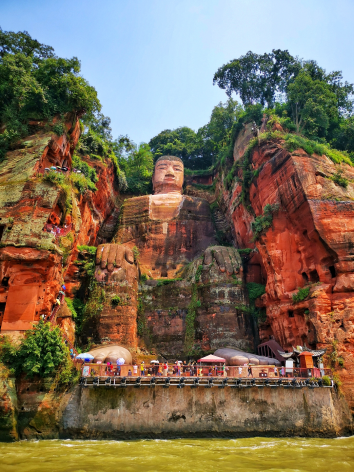樂山大佛,它是依凌云山棲霞峰臨江峭壁鑿造的一尊大佛,高71米,是世界上最大的一座石刻大佛。樂山大佛又名凌云大佛,佛家經(jīng)典建筑,位于四川省樂山市南岷江東岸凌云寺側(cè),是中國(guó)最大的一尊摩崖石刻造像,始建于唐朝,歷時(shí)90載完成,樂山大佛頭與山齊,足踏大江,雙手撫膝,大佛體態(tài)勻稱,莊嚴(yán)殊勝,通高71米,頭高14.7米,腳背寬8.5米,腳面可圍坐百人以上,大佛的頭頂上共有螺髻1051個(gè),遠(yuǎn)看發(fā)髻與頭部渾然一體,實(shí)則以石塊逐個(gè)嵌就,栩栩如生,大佛為一尊彌勒座像,雍容大度,氣魄雄偉,是中國(guó)最大的一尊摩崖石刻造像,被譽(yù)為山是一尊佛,佛是一座山。在大佛左右兩側(cè)崖壁上,有兩尊高16米的護(hù)法天王石刻,與大佛一起形成了一佛二天王的格局,還有數(shù)百上千尊石刻塑像,宛然匯集成龐大的佛教石刻藝術(shù)群。